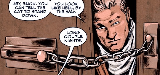 Back in Brooklyn after his epic battle at The Forge, Steve goes to check up on Bucky, who is deep into figuring out the conspiracy situation with Alpine's help --